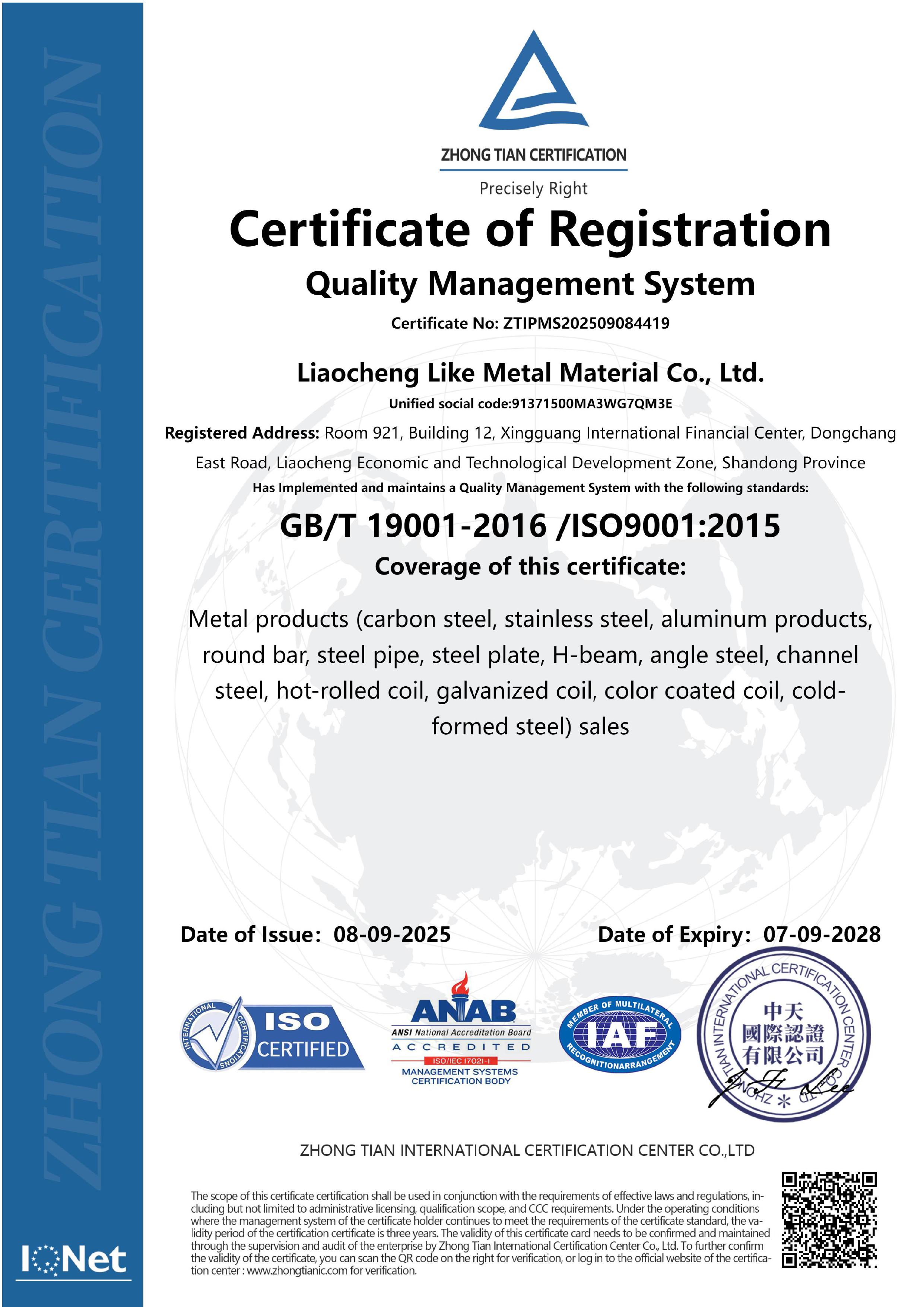 Liaocheng Like Metal Material Co., Ltd. adhering to the "professional, honest, trustworthy" business philosophy is committed to the production of stainless steel, carbon steel, galvanized, copper, aluminum and other products, to provide world-class product quality and service. We have many years of production and business experience, our integrity and quality service has been unanimously affirmed and praised by customers in various industries, and won excellent goodwill for the enterprise.